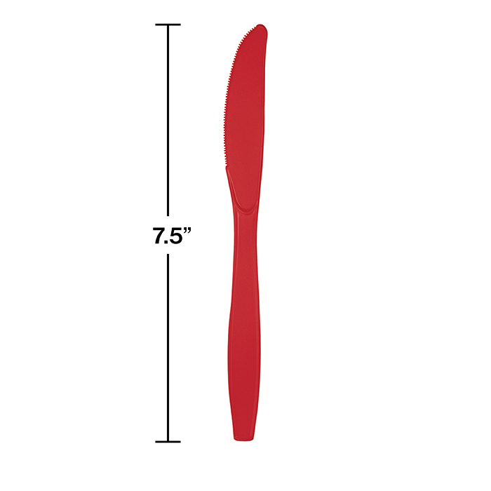 Our wholesale Classic Red Plastic Knives and other red cutlery will exceed your expectations while meeting your serving needs. Event planners and party hosts looking for sturdy plastic cutlery in bulk will love the exceptional quality and design of these elegant wholesale classic red knives. Each disposable plastic knife offers quick post-party clean-up; you can quickly discard or recycle our heavy duty plastic cutlery after events. Plus, our wholesale plastic silverware is competitively-priced, making our entire classic red plastic cutlery perfect for restaurateurs, caterers, party planners, and savvy party hosts on a budget.