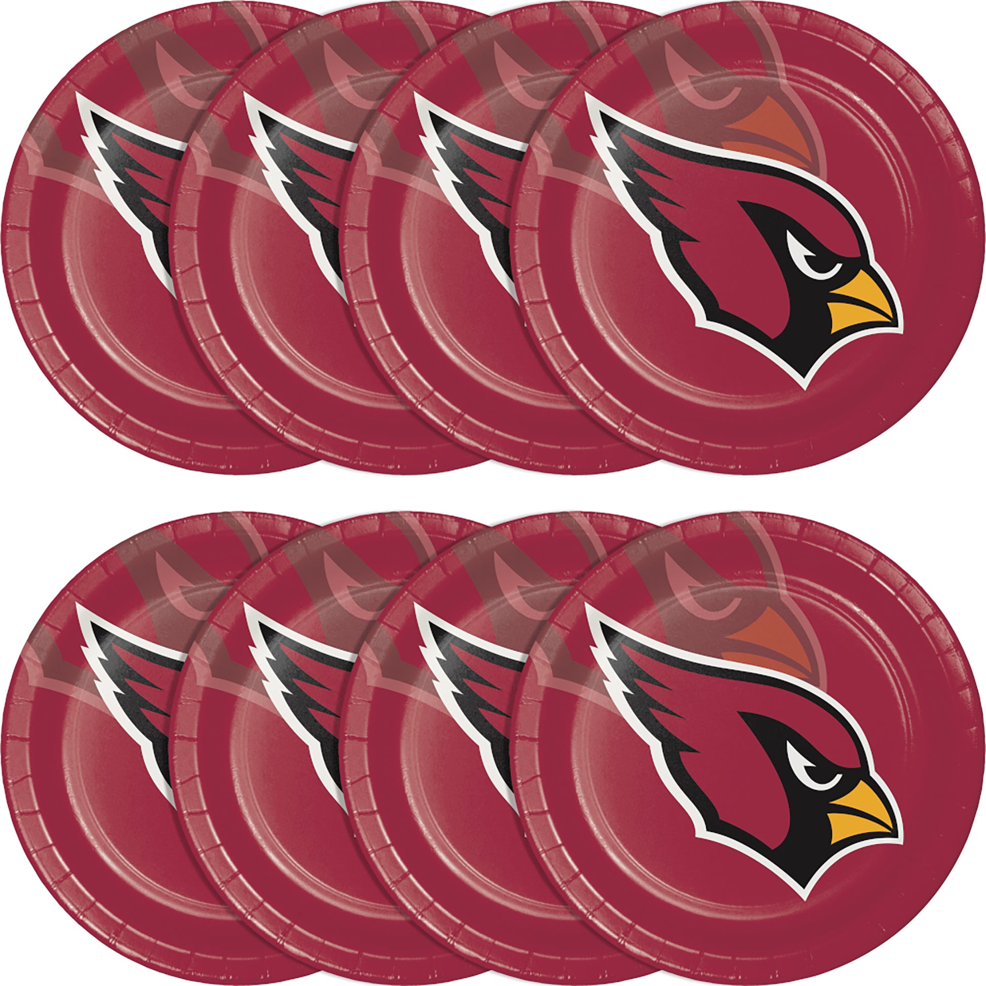 Avoid a game day foul and feed fans on these festive wholesale offerings! Our officially licensed Arizona Cardinals Dinner Plates feature your favorite team's colors and logo for the perfect addition to any tailgating event, game day party, or even everyday use for the super fan. The durable red heavyweight paperboard plates feature the recognizable cardinal head logo in the center with a larger transparent version in the background. Serve up pizza, grilled meats, sandwiches, sides, and any other hearty snacks with confidence. Dinner plates measure 8.75" in diameter and are packaged in quantities of 8 with 12 packages per case.