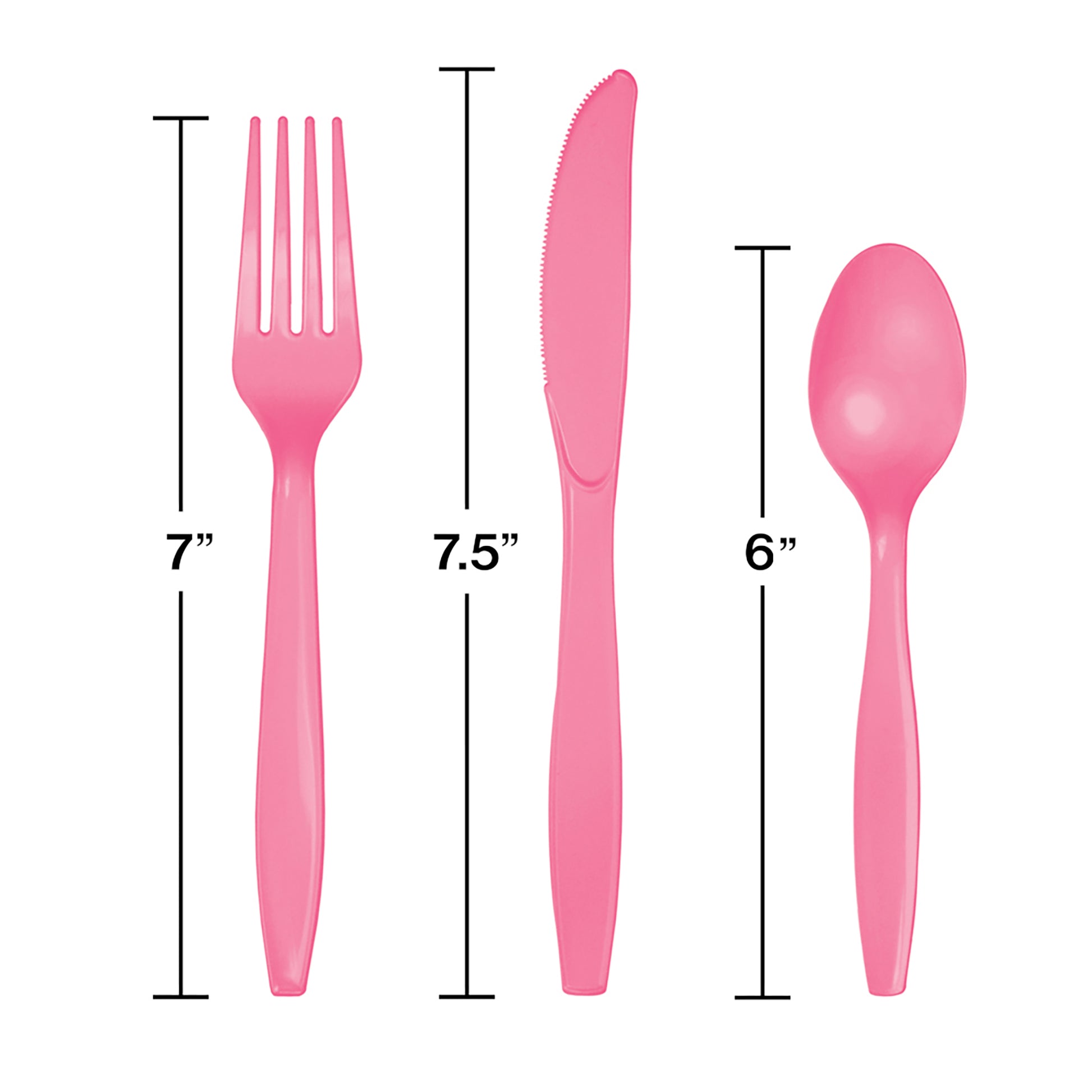 The Candy Pink Assorted Disposable Cutlery from our Touch of Color collection is an economical and stylish alternative to the real thing. Constructed from premium plastic in a pretty bubblegum pink shade that coordinates with all the Candy Pink party supplies, the assorted cutlery set comes with a spoon, fork and knife for each of 8 place settings. Perfect for use at weddings, corporate functions, family gatherings, or any special occasion that will have a large crowd in attendance. The 288 count Candy Pink Assorted Plastic Cutlery retails 24 pieces per package and is sold 12 packages per case.
