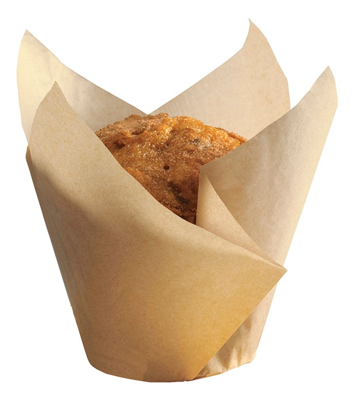 Give your standard size bakery confections a beautiful presentation when you present them inside the Natural Tulip Cups. The large tulip cup is constructed from a 7 inch square of high quality greaseproof baking paper that measures 2.25" x 2.75" x 4" tall and is suitable for ovens up to 425° F. The high quality decorative liner comes molded to perfectly fit inside a 4-5 oz. standard size muffin tin and features 4 pointed peaks to envelope its sweet contents of your baked masterpiece. The natural color is a light tan and is especially complementary to organic and health conscious baked goods recipes and confections. Tulip cups are sold in bulk 1,000 count packages that feature 4 packages of 250 large sized liners.