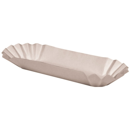Cradle oblong deli style sandwiches and standard size hot dogs or polish sausages with a Medium Weight 6" Fluted Hot Dog Tray. The kosher certified white paper tray is the perfect solution for serving your delicious dogs and 6" long sandwiches with ease! The convenient tray features a bottom width that measures 1.625 inches wide surrounded by fluted walls that stand 1.25 inches tall for keeping condiments where they belong. The Medium Weight 6" Fluted Hot Dog Tray is sold in 3,000 count bulk cases with quantities of 6 poly wrapped packages of 500 each to conveniently restock at restaurants, deli counters, mini marts and more.