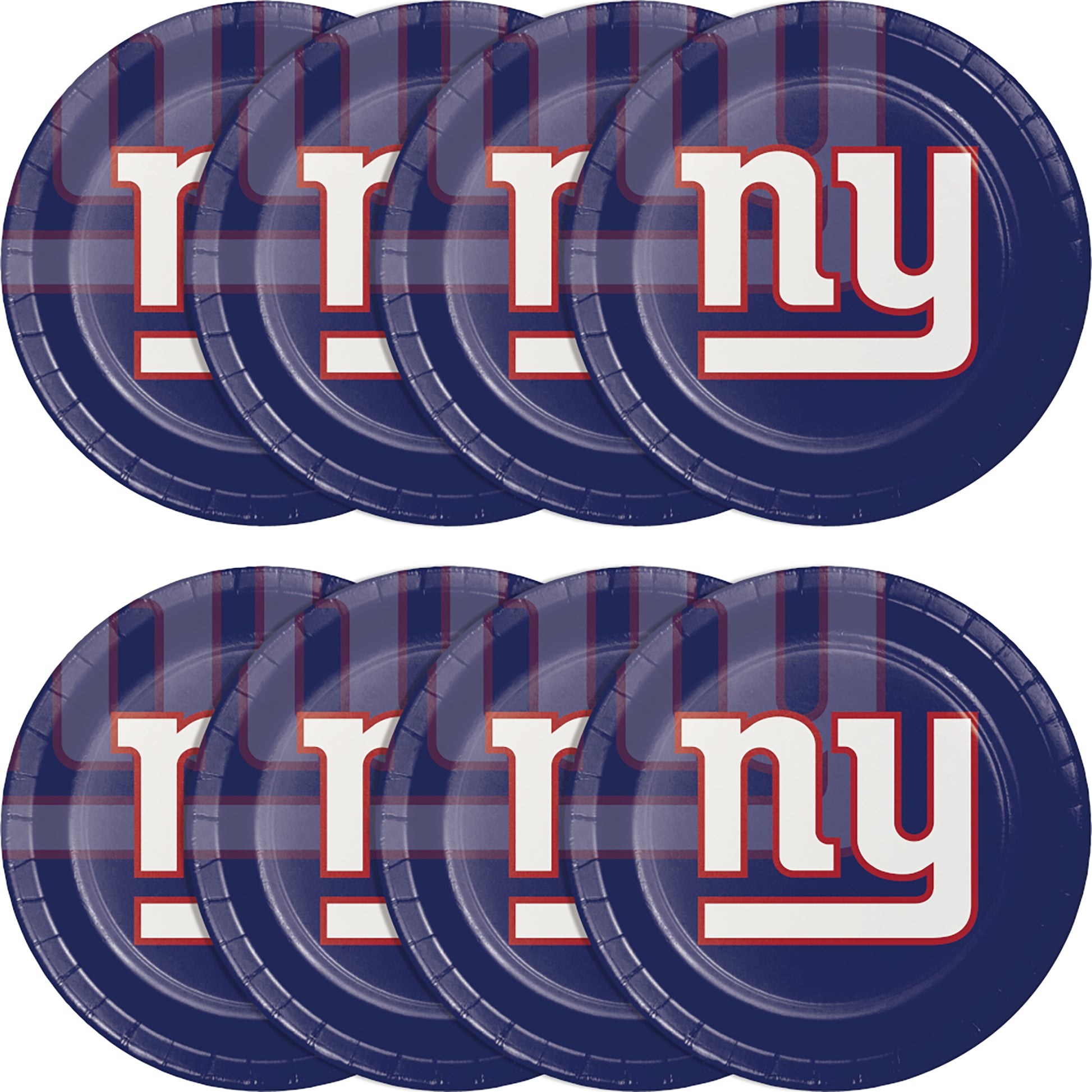 Serve delicious meals on licensed NFL party supplies guaranteed to inspire team support. The New York Giants Dinner Plates are constructed of heavyweight paper board stock that is perfect for holding hot servings of burgers and sausages or concession offerings of pizza or sandwiches. The sturdy, disposable plates are decorated in royal blue and feature a large white ny" in the center outlined in red. In the upper left the same logo is fading into the background. Retailers, businesses and event planners will score winning points with patrons and guests when the round plates are presented with other products from the theme or with solid colored tableware and accessories for a winning combination. Dinner plates measure 8.75 inches in diameter and are sold 8 per package with 12 packages per case.