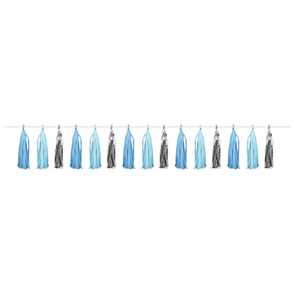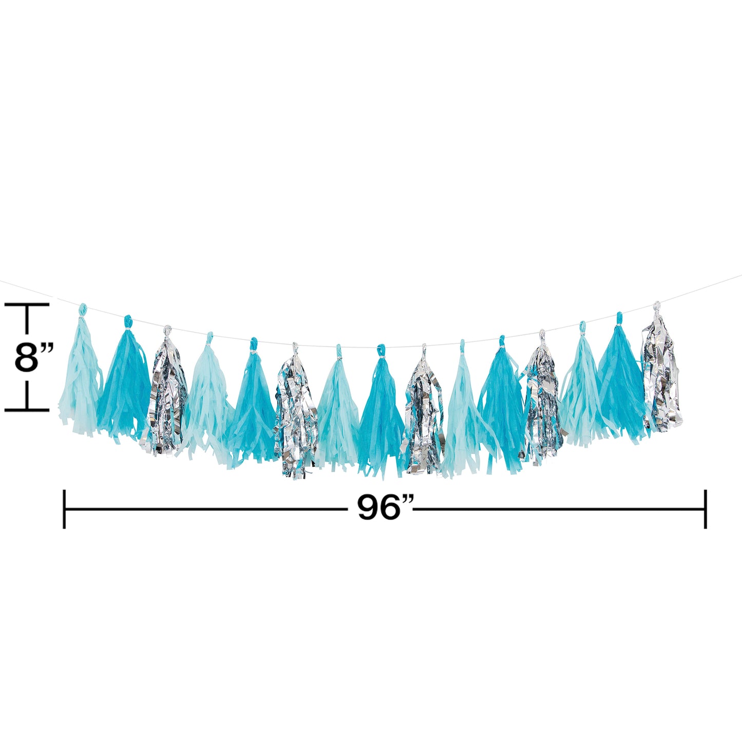 Add a unique touch to your décor with this Blue and Silver Celebration Tassel Garland. Featuring different blue and silver tassels, this is the perfect addition to your celebration. Measuring 8" x 96" and sold in quantities of 6, this garland can be paired with any other Blue and Silver Celebration With wholesale pricing and bulk quantities, our Blue and Silver Celebration Tassel Garland 6 ct are perfect for event planners, caterers, and home hostesses alike.