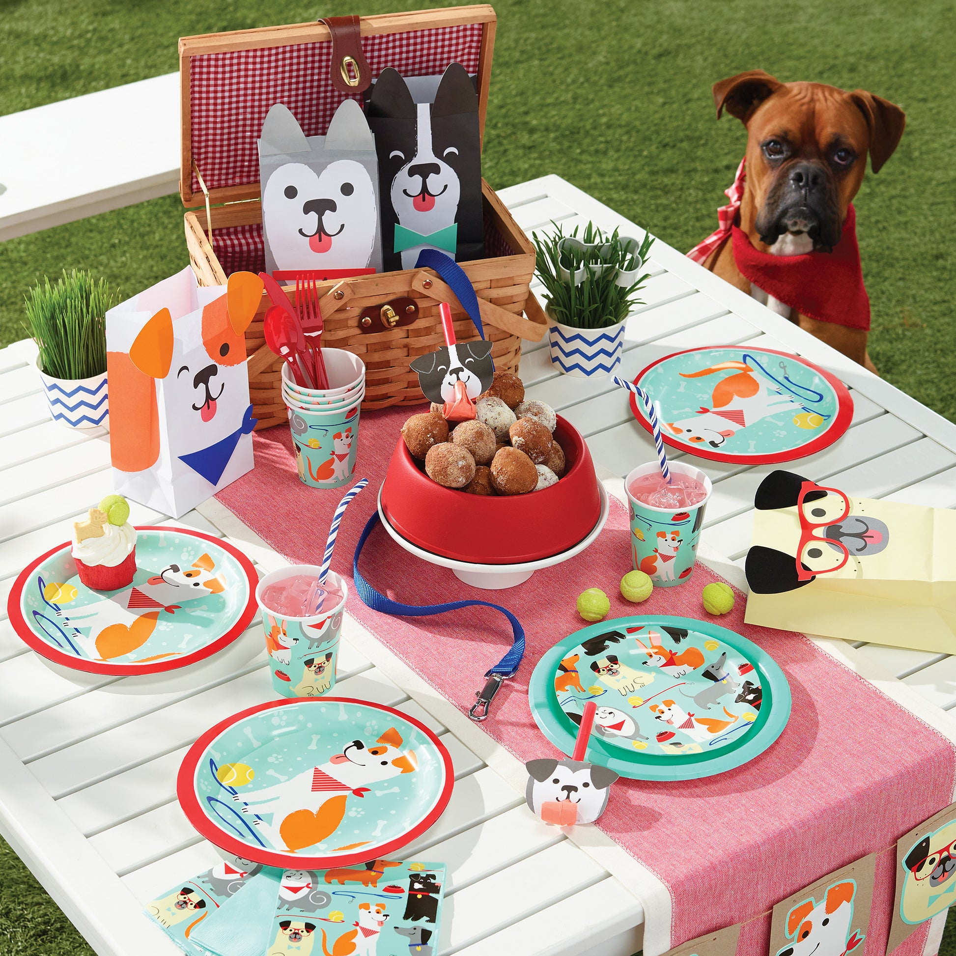 With the Dog Party Paper Plates, you're bound to have a doggone good time. The Sturdy Style paper plates measure 9" round and display a light blue background that is covered in white bones, dots and paw prints. The design features a large, smiling dog that is wearing a bandana around his neck. The paper dinner plate can be combined with other Dog Party party supplies. With wholesale pricing and bulk quantities, our Dog Party Dinner Plates 96 ct are perfect for event planners, caterers, and home hostesses alike.