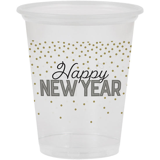 Ideal for soda, cocktails and beer, the Happy New Year Plastic Cups are a perfect addition to your party. These sturdy plastic cups hold 16 oz and feature the words "Happy New Year" and confetti with a black, silver, and gold theme. Sold in packs of 96, these disposable plastic cups coordinate with all New Year Décor party supplies. With wholesale pricing and bulk quantities, our Happy New Year Plastic Cups 96 ct are perfect for event planners, caterers, and home hostesses alike.